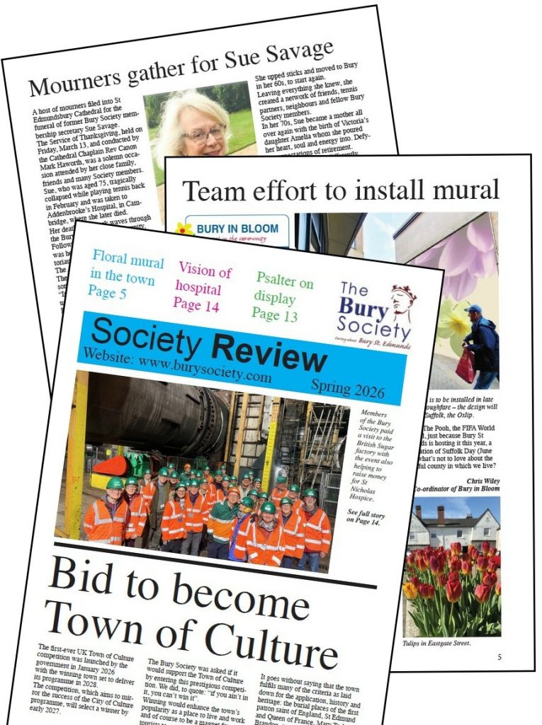 ‘The Bury Society Review is an important element in what we do as the three issues (Spring, Summer and Winter) keep the members abreast of our work and achievements, advises of upcoming social events, and provides articles of interest about the town, past and current. It exists to inform and entertain.